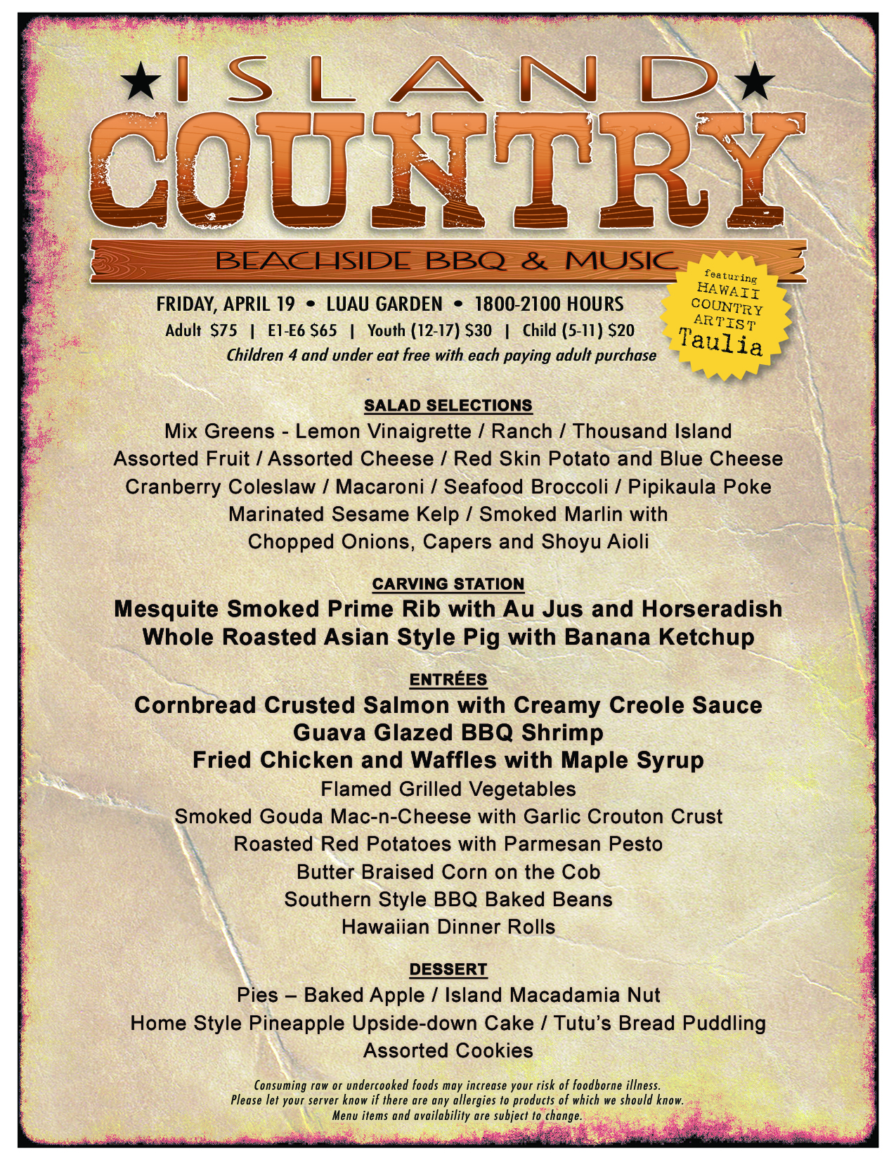 Kick off your weekend Country Style at the Hale Koa Hotel on Waikiki! Join us for an unforgettable evening featuring the soulful tunes of Hawaii Country Artist, TAULIA, paired with an exquisite Country Style BBQ Dinner Buffet. Round up your crew and get dressed in country attire for a toe-tappin' night of country Fun at Hale Koa Hotel!