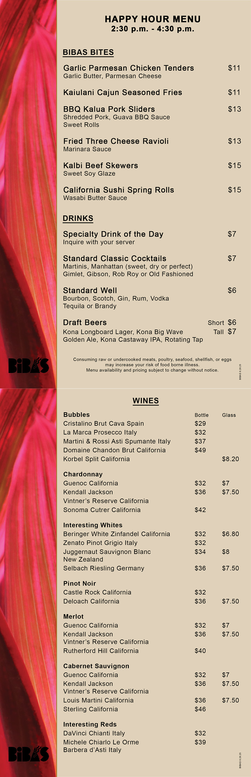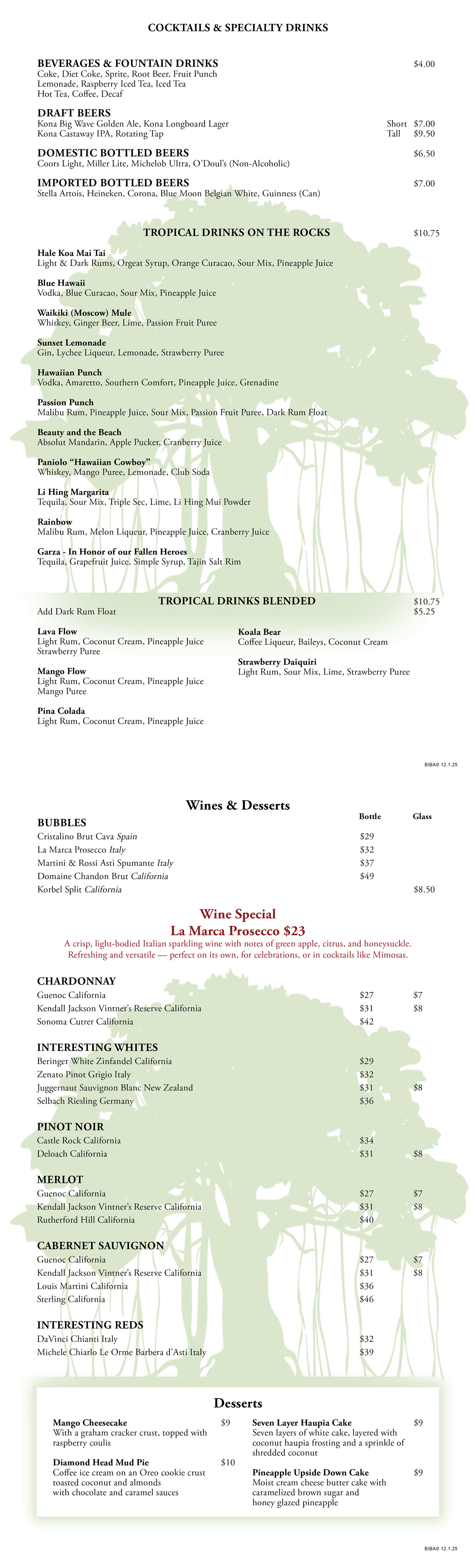 A list of cocktails, wines, beers and soft drinks served from Lunch to Dinner.