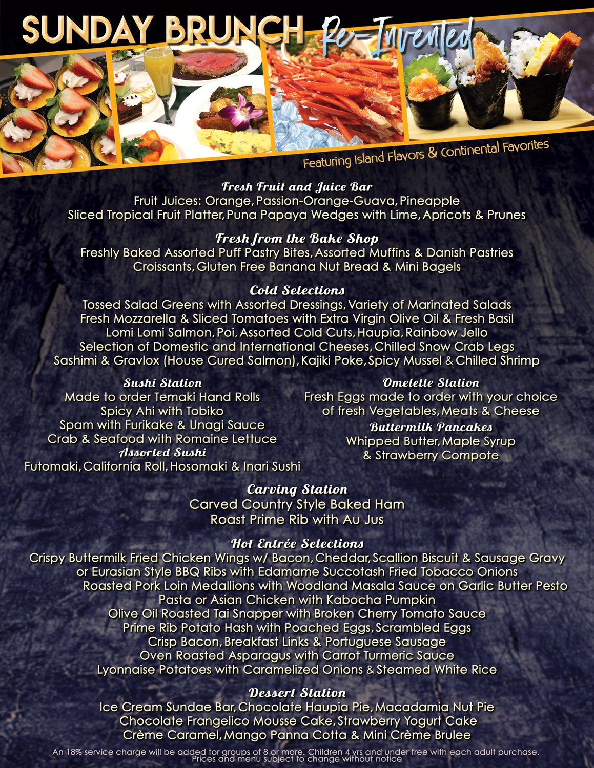 We’re proud to take brunch to a new dimension with made-to-order hot dishes like pancakes and omelets, cold seafood and salads, and stations for rolled sushi and carved meats. Top it all off with a make-your-own sundae station and toast to many happy returns with a free glass of champagne, mimosa or sparkling cider. Come experience what a Hale Koa Hotel Brunch on Sunday looks like.