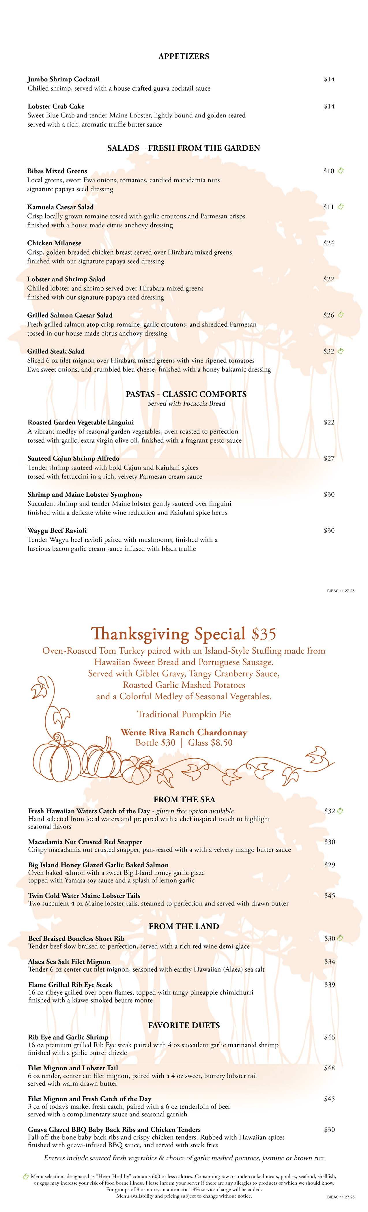 Bibas Courtyard Grill Thanksgiving Holiday Menu