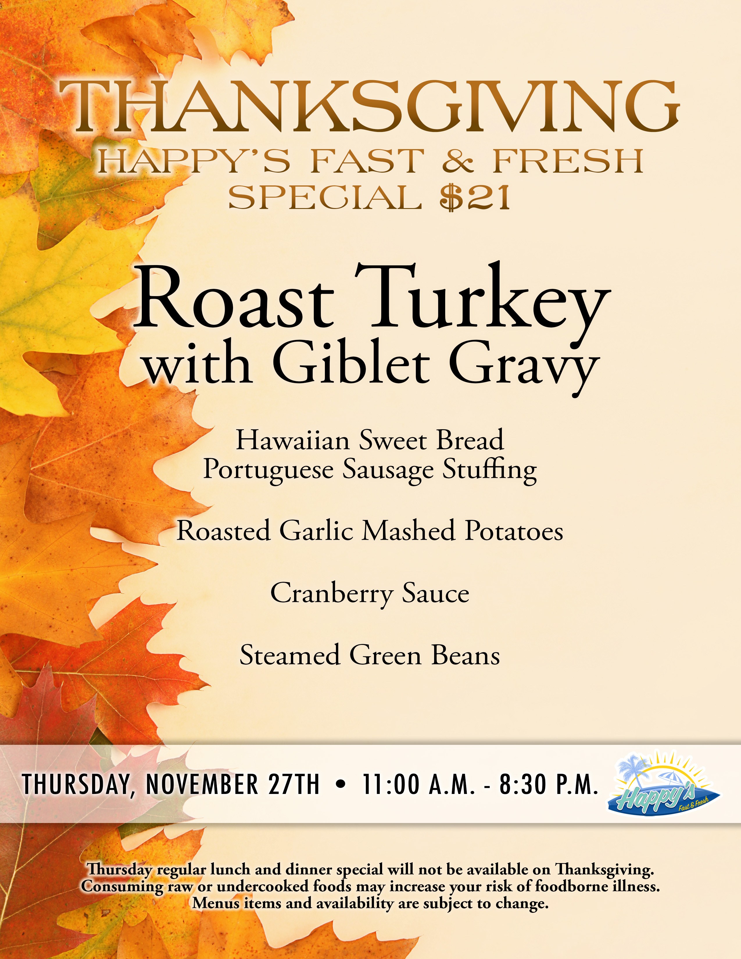 Thanksgiving Day Hours: 4 p.m. to 8:30 p.m. (No Happy Hour)
