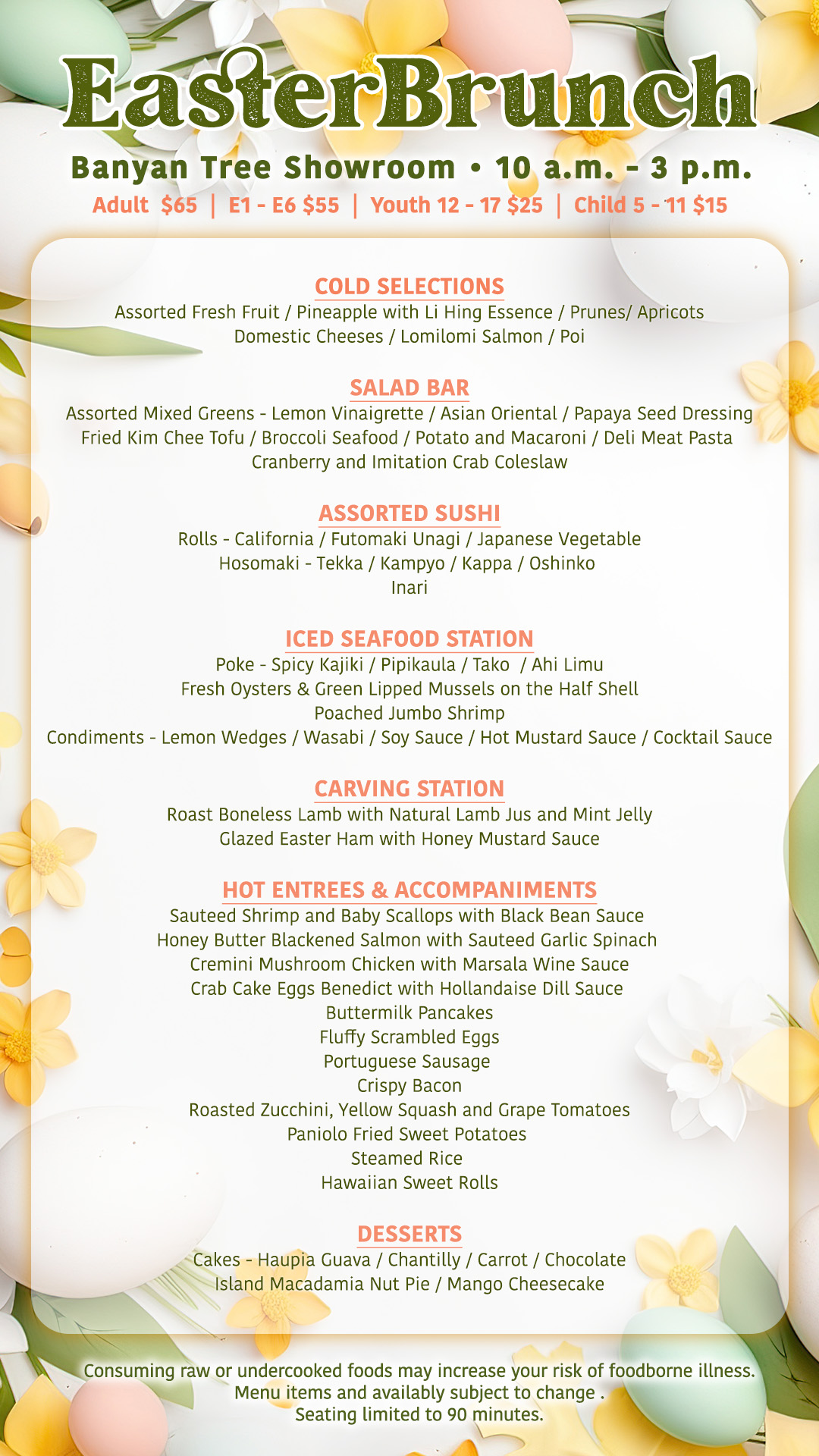 Make plans now to join us at our featured spring event worthy of the Easter Bunny himself! It's the perfect place to gather with family and friends to celebrate this special occasion. Feast on an eggs-pansive spring buffet with delicious and tantalizing selections for the entire family.