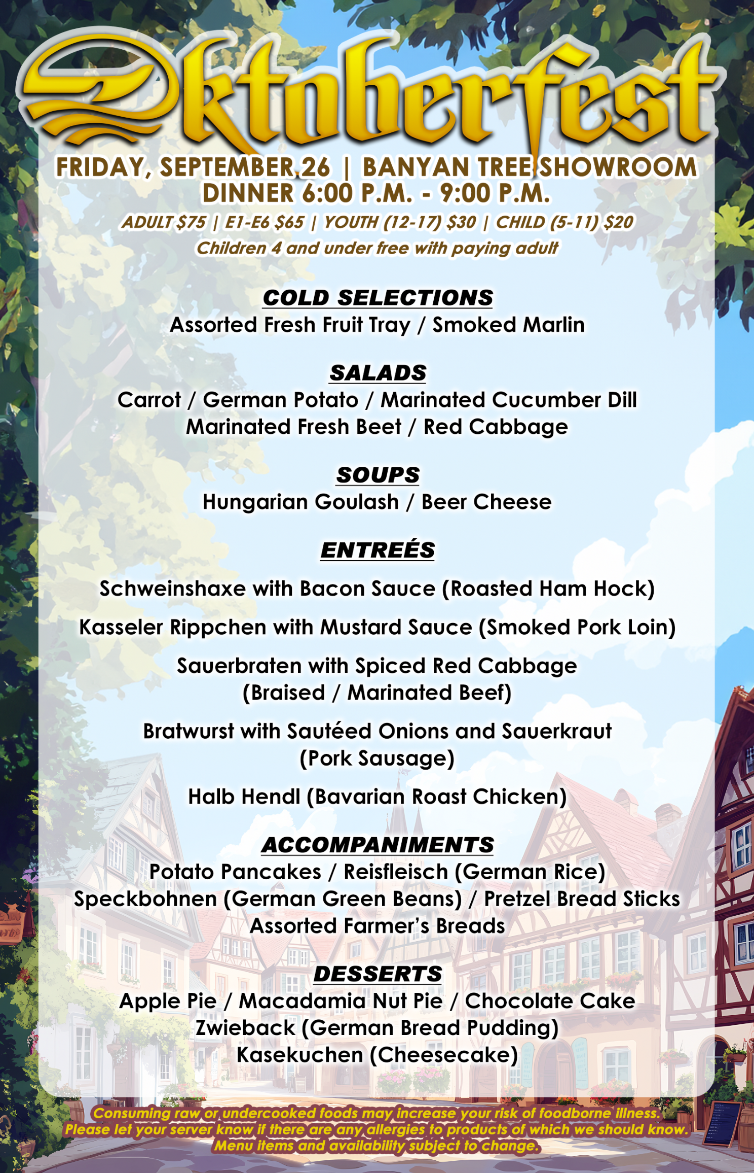 Feast on a bountiful buffet of Oktoberfest favorites, Sauerbraten, Schweinshaxe, Bratwurst and more. View Menu